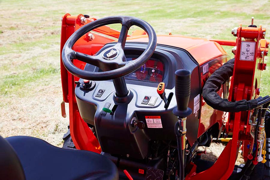 Featuring either a 37hp or 42hp Daedong diesel engine and brilliant new design, the CK Series is the latest compact tractor design from Kioti Daedong. Featuring the choice of a smooth three range Hydrostatic transmission or cost-saving Manual, they make the perfect addition to any site. The CK Series is available in three models – the CK3710, CK4210 and CK4220, in range of ROPS/Cab and Manual/Hydrostatic combinations. The eco-friendly Daedong diesel engines are not only fuel efficient, they also produce minimal noise, little vibration and meet or exceed EPA regulation. The performance proven, heavy duty hydrostatic drive delivers power and efficiency. This three range transmission (high, mid, low) features simple twin pedal operation, that makes your job easier, smoother and safer. The illuminated dashboard ensures great visibility while working in bright daylight or at night. Dual HST pedals and joystick are conveniently located for optimum operator comfort. Front-end loader work is also made easier by the use of a single lever joystick that returns to neutral when released, and a float position allows the bucket free flotation over the ground surface.
